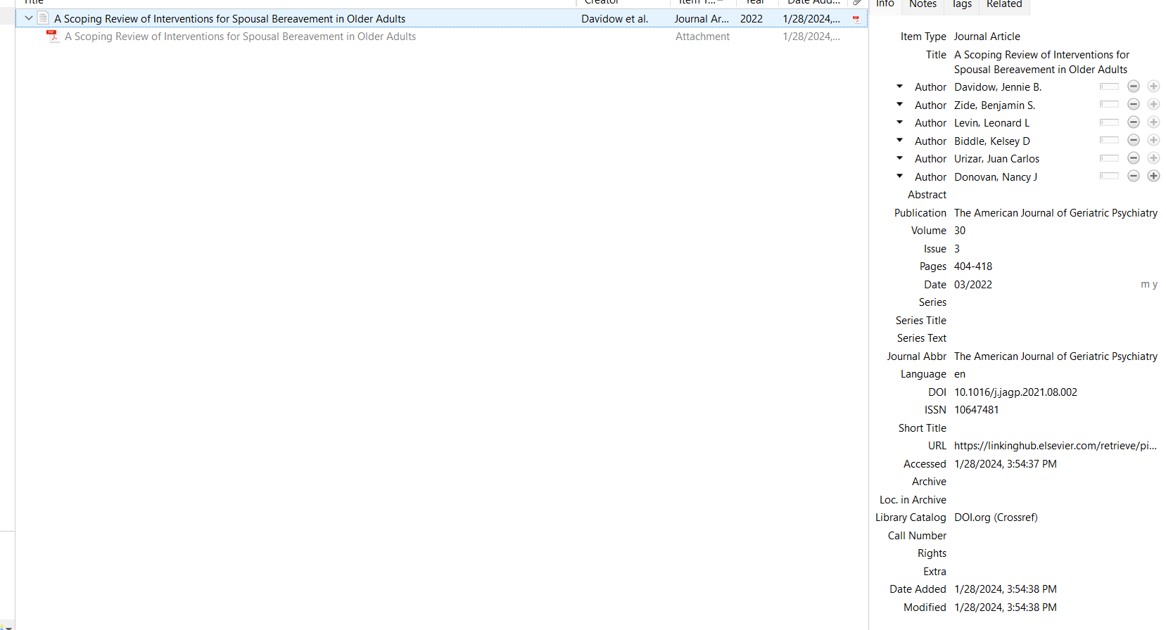 Davidow, J., Zide, B., Levin, L. L., Biddle, K. D., Urizar, J. C., & Donovan, N. J. (2022). A scoping review of interventions for spousal bereavement in older adults. The American Journal of Geriatric Psychiatry, 30(3), 404–418. https://doi.org/10.1016/j.jagp.2021.08.002