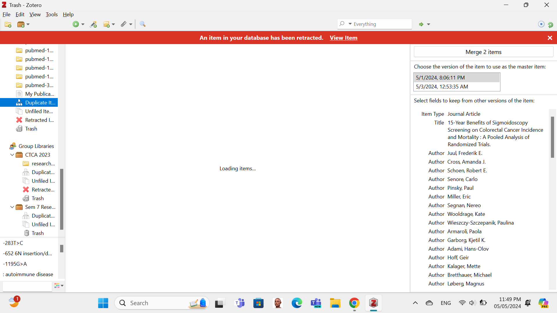 Regarding your question about the Duplicate Items, I've recently taken the step to unlink my account and have deleted all my Zotero data on my computer associated with that account, so I am currently unable to provide information about the Duplicate Items as you requested. Sorry for the inconvenience caused.