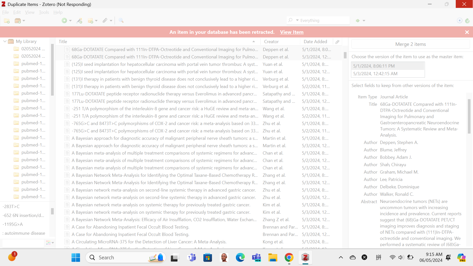 Attached to this is a screenshot illustrating the problem. As you can see, Zotero frequently displays "Not Responding" and takes an extended amount of time to process actions, making it challenging to navigate and utilize the application effectively.