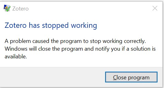 Since Zotero updated to 7x yesterday, it now fails to open. It begins to open but as it appears to be on the verge of completing opening it stalls and a popup appears that says "Zotero has stopped working".
