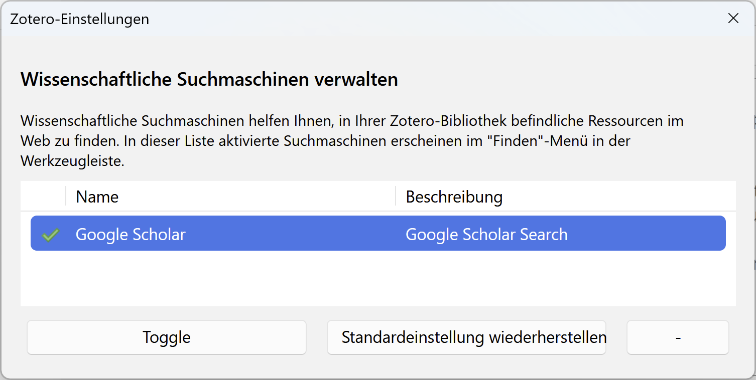 Since zotero already has a global settings window, maybe putting the search engine setting into that context would be a considerable move.