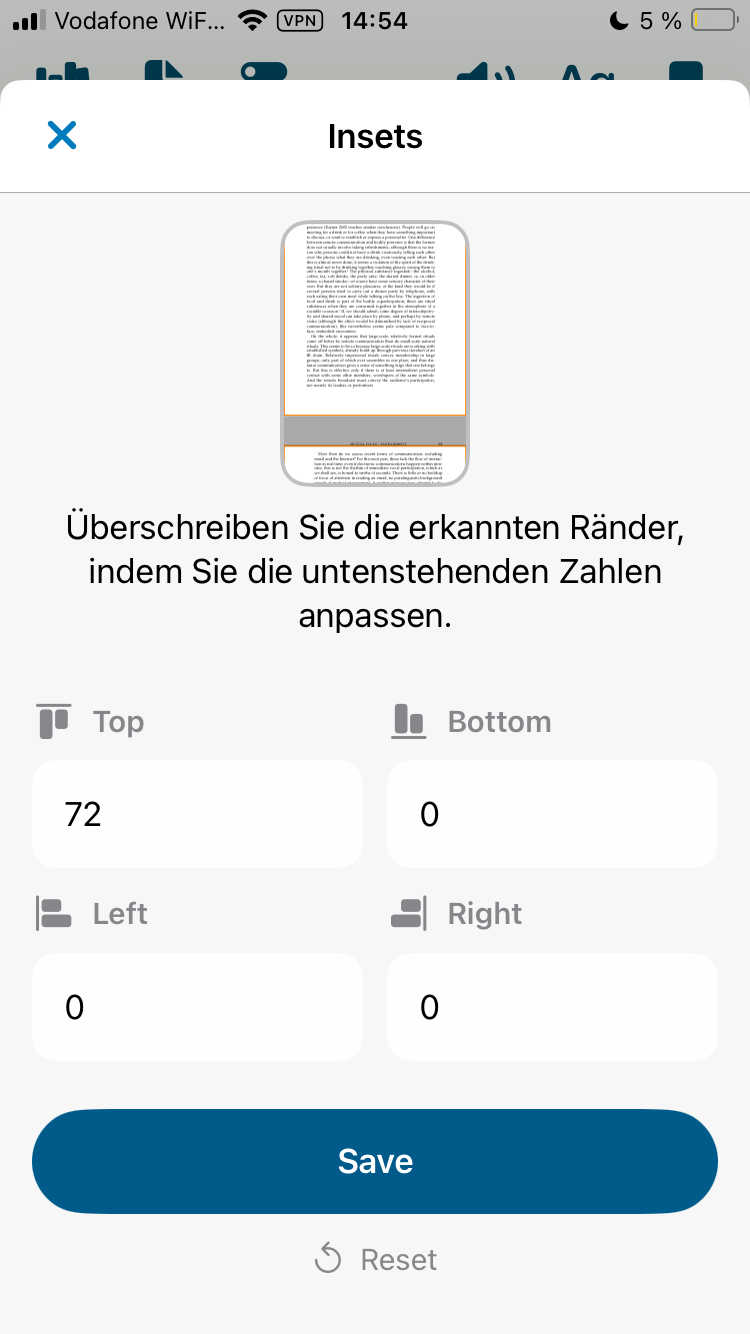 In the iOS App "Voice Dream", there is the option to show the automatically recognized margins and set them manually if necessary (see attached screenshot). They do this to prevent the app from reading out loud page numbers and so forth. I would love to have the option to specify the margins in Zotero too, as I principally love the new feature to highlight over two pages and this would make this functionality way more usable. As long as there isn't a feature like that I would be super greatful for any information on how I can edit a PDF so that the highlighting option automatically excludes footnotes/headers.