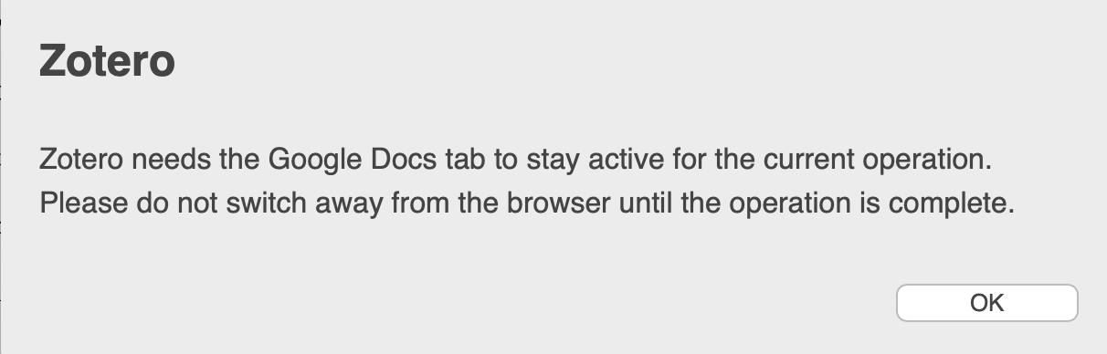 I am at my wit's end. Zotero was working fine for a while for a paper I'm writing in Google Docs. Then, suddenly, every time I try to cite the red loading bar gets stuck and I get this message: "Zotero needs the Google Docs tab to stay active for the current operation. Please do not switch away from the browser until the operation is complete" (screenshot attached). When I click "OK," the document starts, of its own accord, cycling through "find/search" for every period in the entire document, over and over again (like if i were to command-F ".") and does not stop unless I exit or refresh the document. I've updated Zotero, then uninstalled and reinstalled it, and also tried it in both Safari and Chrome, and the problem persists. Why is this happening? How do I fix it? Why did it start randomly?