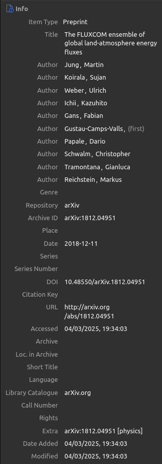 Jung, M., Koirala, S., Weber, U., Ichii, K., Gans, F., Gustau-Camps-Valls, Papale, D., Schwalm, C., Tramontana, G., and Reichstein, M.: The FLUXCOM ensemble of global land-atmosphere energy fluxes, https://doi.org/10.48550/arXiv.1812.04951, 11 December 2018.