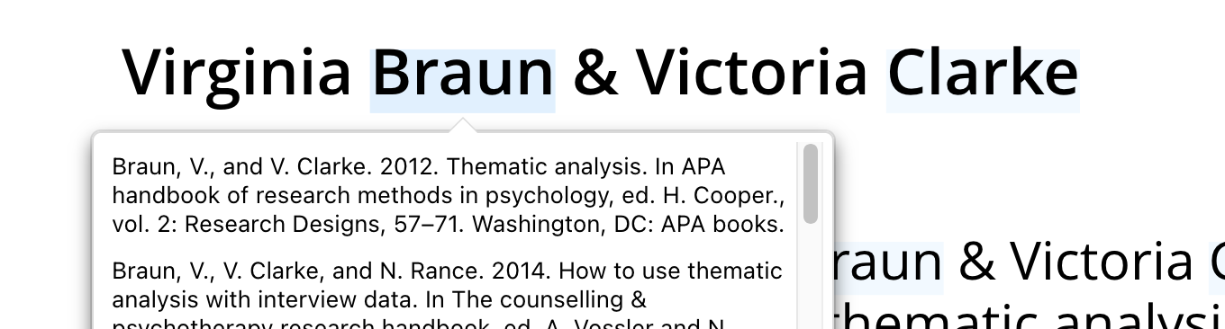 This feature is helpful: you hover over the name and the citations popup, which are clickable and load the relevant article in your browser.
