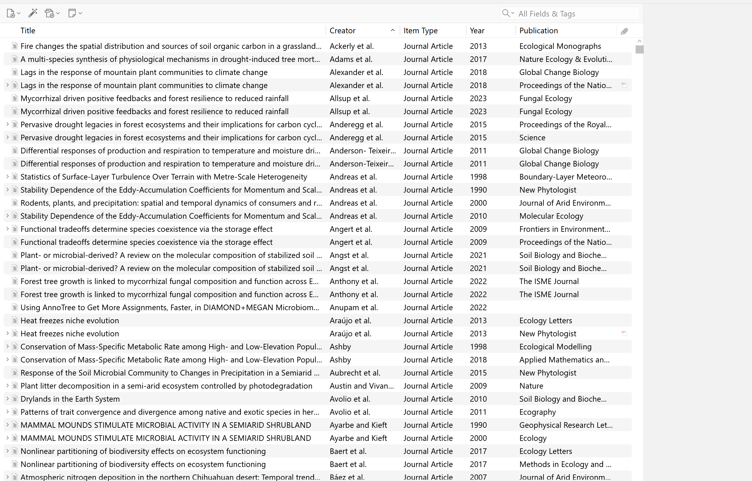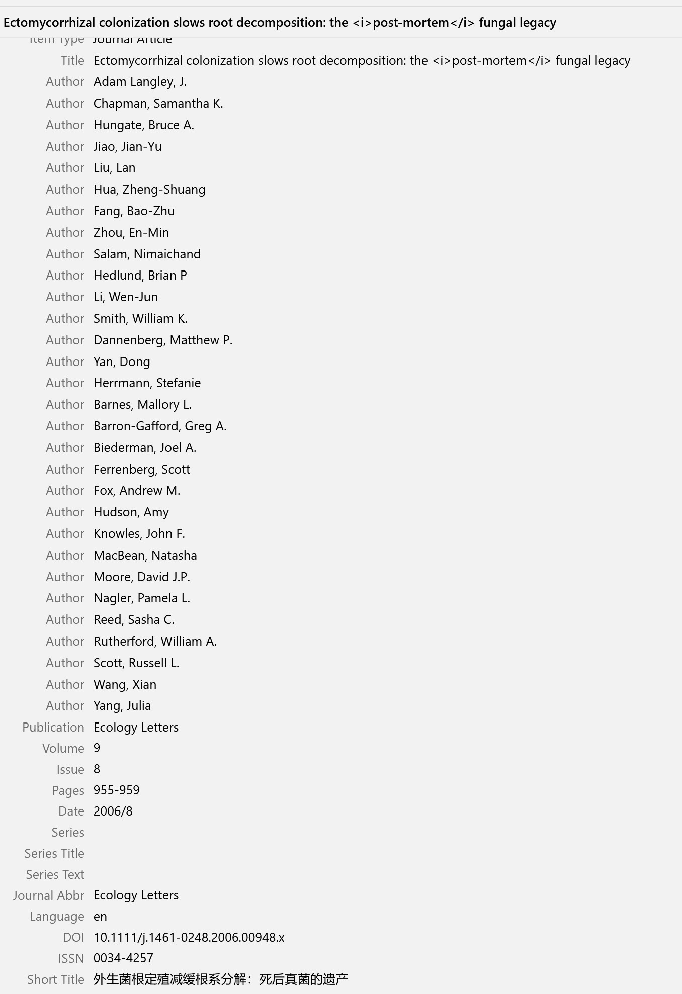 my zotero library of 5,000+ references has been scrambled and apparently hacked. Many of the references have now the wrong list of authors (but retain the correct title and volume) or the wrong journal title. Often, the journal title is mismatched to the journal title abbreviation. There are also chinese characters that appear in the short title field that were never there before, and also sometimes at the bottom of the abstract. E.g., 叶片大小、树苗异株性和 Corner 规则:枫树(Acer)的系统进 or 化和相关进化 外生菌根定殖减缓根系分解:死后真菌的遗产