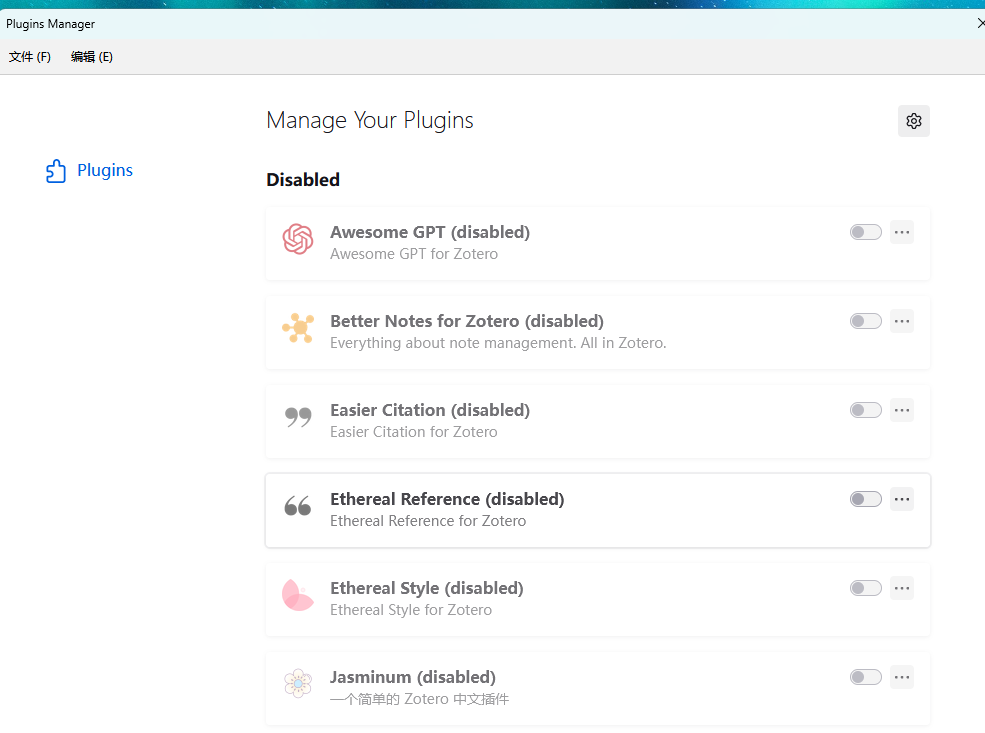The Zotero plugin on the Edge browser is not working; the icon appears gray. During troubleshooting, all plugins were disabled, but after exiting, all plugins still appear disabled and cannot be restored.