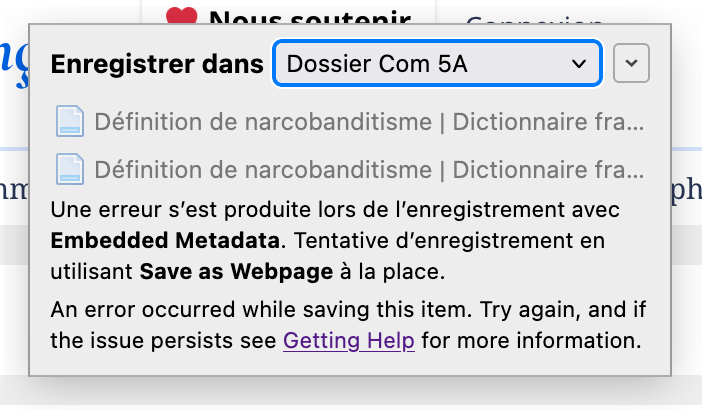Je vois un message "Mise à jour disponible : The Zotero Connector must be updated to work with this version of Zotero." + le message en screenshot ci-joint.