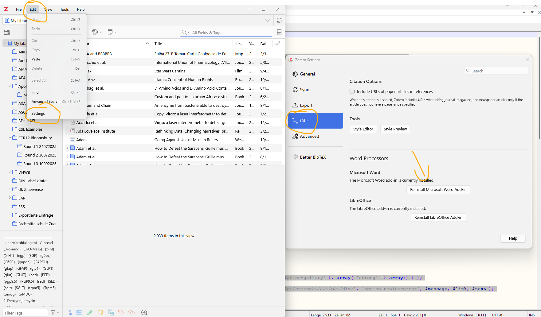 I also read online that I could try re-installing the Zotero-Word plug-in but I do not seem to be able to do this. The website is telling me to click Edit --> Preferences --> Cite --> Word Processors. But I do not have any option for Edit. In fact in my Zotero online and on the computer there is no menu along the top with options like Edit etc.