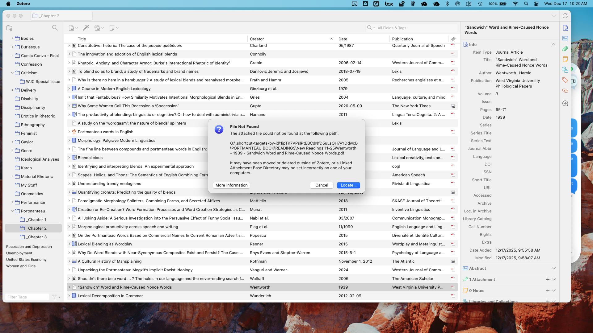 Hello: I have all my instances of Zotero set to relative paths but when I switch between computers, I'm only able to open documents that I attached while using that computer despite using relative paths. To compound the issue, recently when the app's UI changed the Locate button no longer works. I get a message (see attachment) that the file can't be found. When I click Locate now, the dialogue box just closes and I don't get the option to pick a file. I can still pick a file in other instances. I did find a discussion about this from 2019 but no fixes. Please help. This is happening across Mac and Windows. Help!