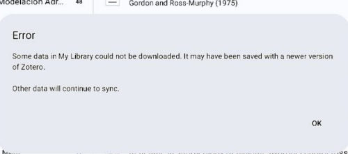 The Android app sync does not complete. I have a library with just over 6,000 items. After a certain point (around 3,300 items synchronized, first synchronization), the app requires the sync to be forced, and then only advances in small groups of approximately 30 items. Each time it freezes, this error window appears: