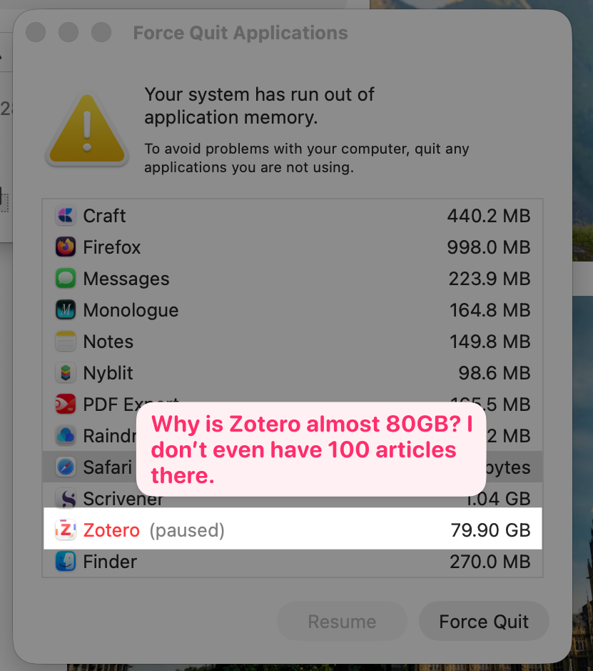 As the title says: Zotero is almost 80gb. I only keep links to active projects and don't use it as storage for stuff to read later so why is this happening? Yes, I can see that I have too many applications open but how does that grow Zotero to this humongous size? What's going on?