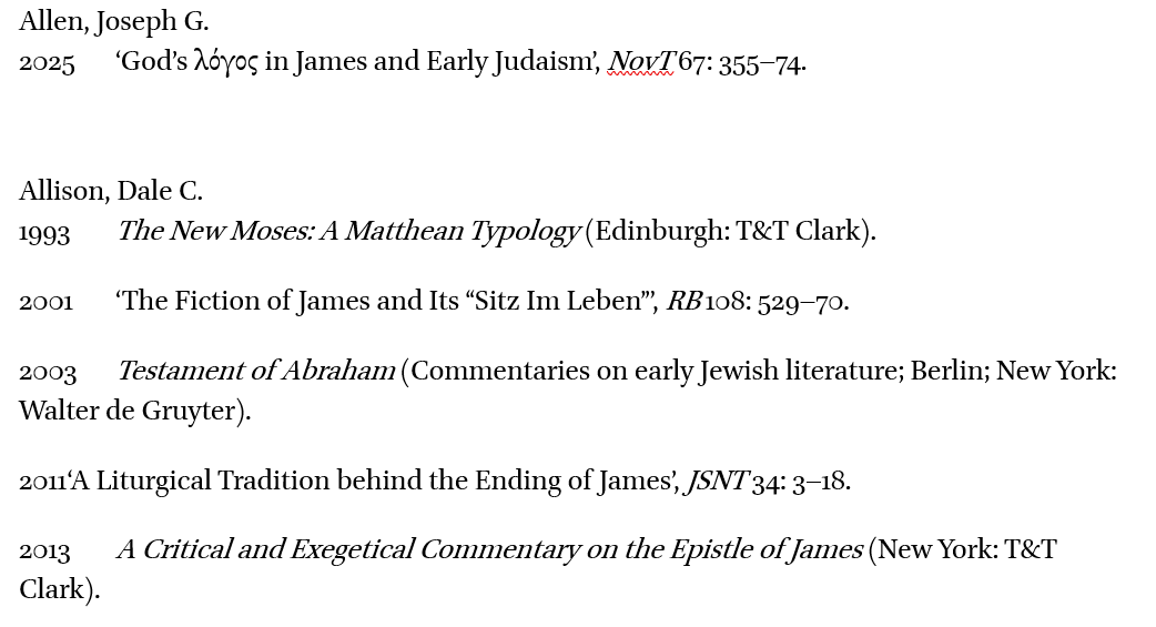I am currently using the Journal for the Study of the New Testament style on Zotero. I am wondering whether it would be possible to edit the style to address the following points, to align the style more closely with the JSNT bibliography. The first image is my own bibliography and the second is from a JSNT article.