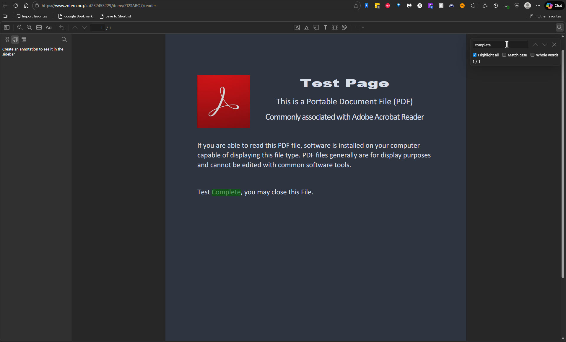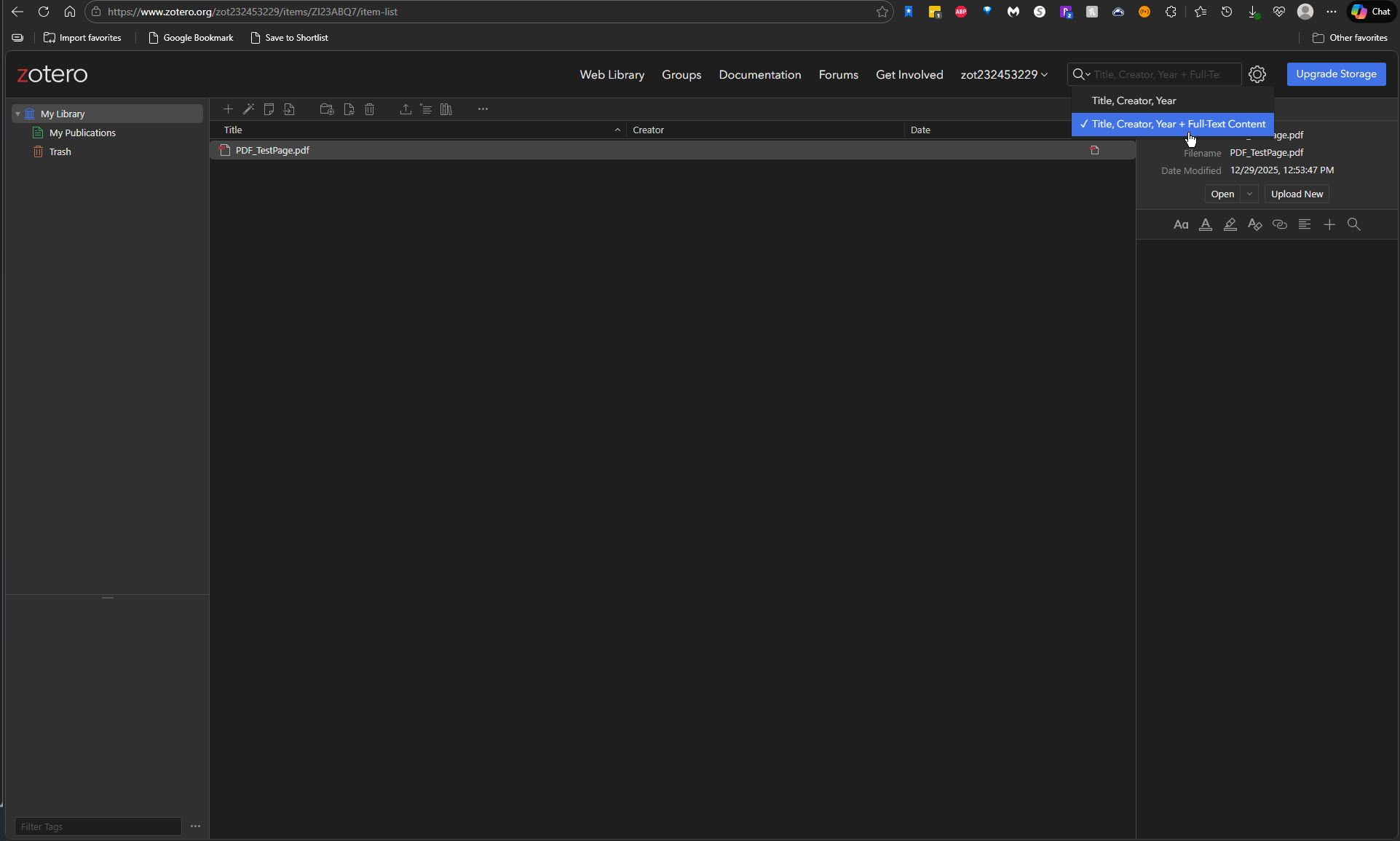I'm starting my quick test of Zotero online by adding a simple PDF text file that has body of text that is searchable. However from the Zotero online after adding a simple test PDF file, i am not able to search the PDF body of texts. But opening it up, i can search.