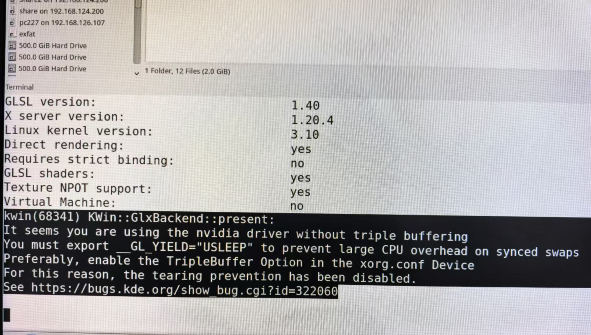 KWin::GlxBackend::present:It seems you are using the nvidia driver without triple bufferingYou must export_GL_YIELD="USLEEPp"to prevent Large CPU overhead on synced swapsPreferably, enable the TripleBuffer Option in the xorg.conf DeviceFor this reason, the tearing prevention has been disabled.See https://bugs.kde.org/show bug.cgi?id=322060