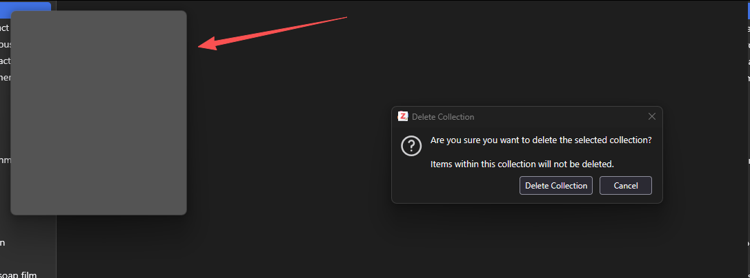 In some cases, a ghost empty right-click menu window is left behind after clicking on Delete Collection: