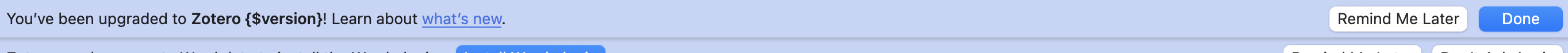 extensions.zotero.postUpgradeBannerVersionShownpref in the Config Editor and restart.Is there a similar config option for "Zotero needs access to Word data to install the Word plugin." and "Zotero now automatically keeps attachment filenames in sync as you make changes to items."?