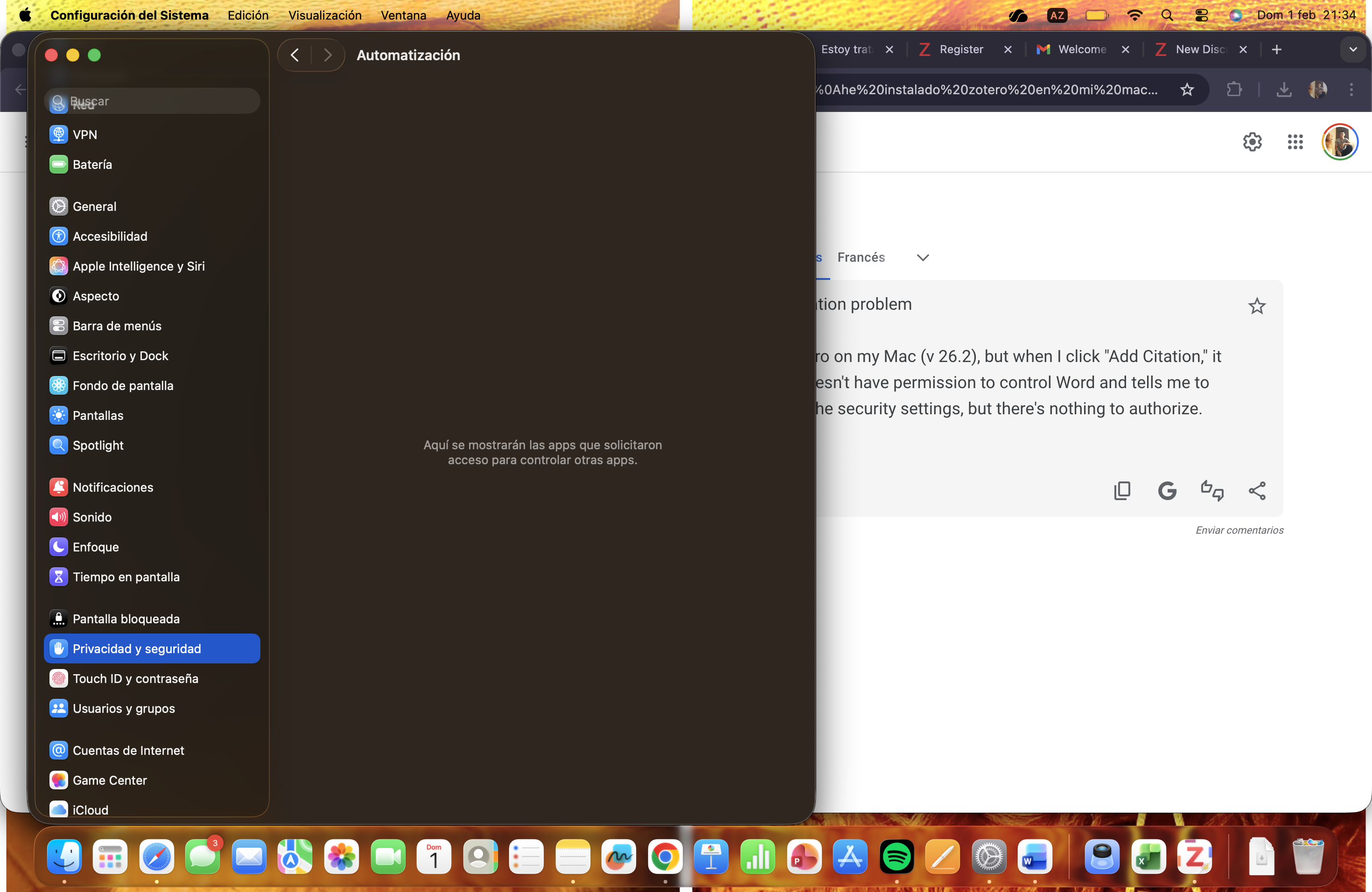 I installed Zotero on my Mac (v 26.2), but when I click "Add Citation," it says Zotero doesn't have permission to control Word and tells me to authorize it in the Security > Automation settings. However, when I access the Security menu, I don't have any pending authorizations. I've already tried reinstalling, but nothing changed.