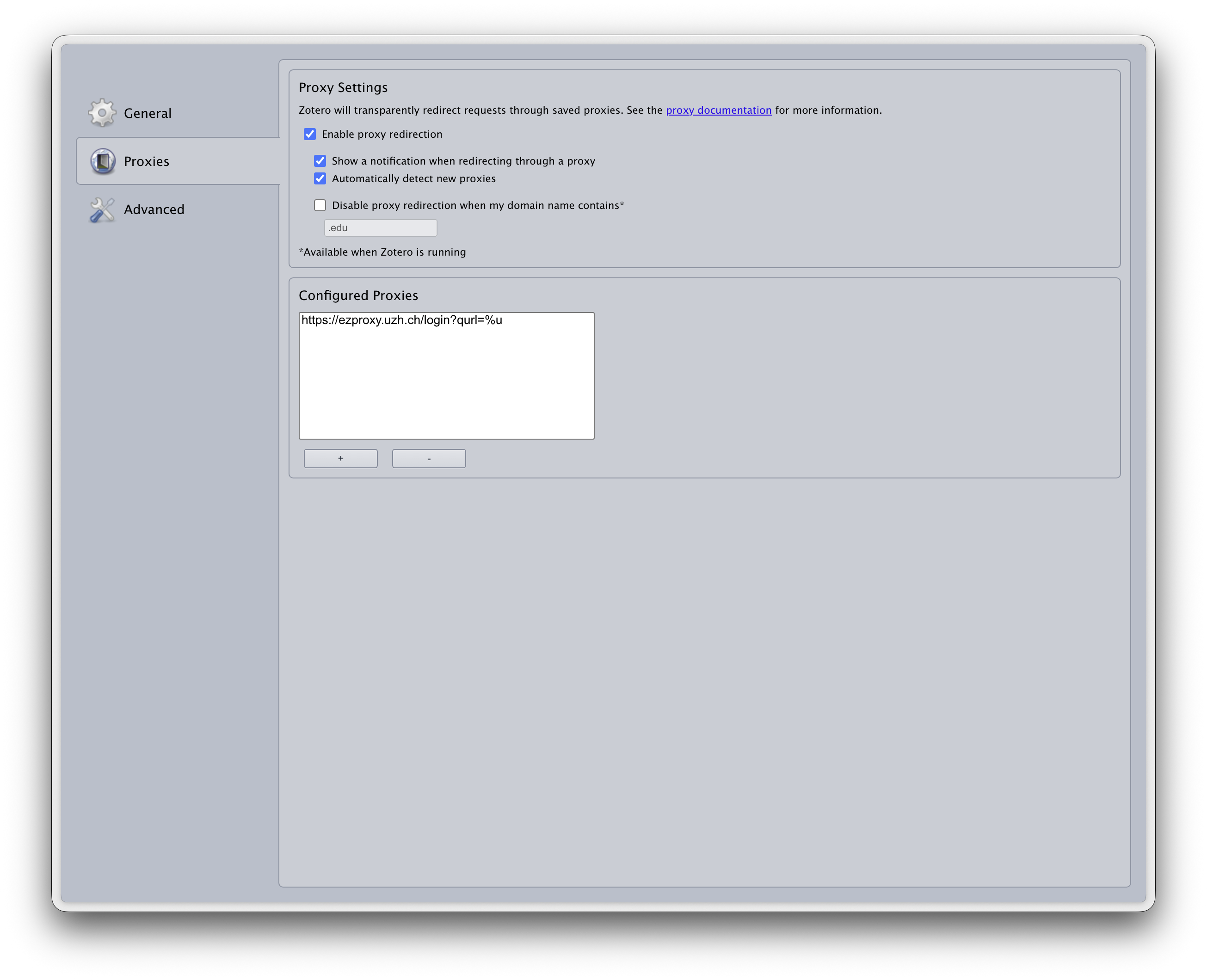 adomasven Zotero TeamIt's not possible to the Zotero desktop application to access resources behind a proxy. You should save items from your browser via the Zotero Connector. For existing items, you should save the articles manually and attach to those items by dragging the file onto them.