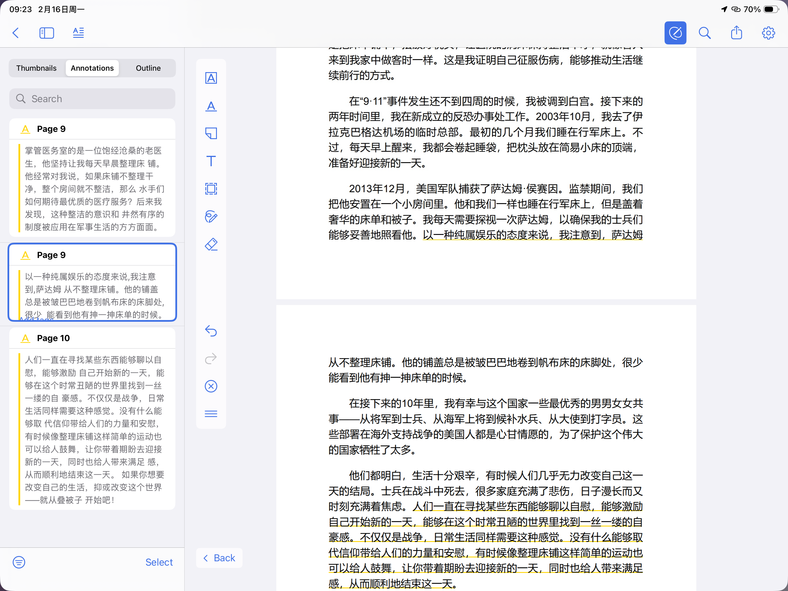 On Mac: I highlighted a full sentence spanning from Page 9 to Page 10. The text is: "以一种纯属娱乐的态度来说... (Page 9) ...很少能看到他有抻一抻床单的时候 (Page 10)".