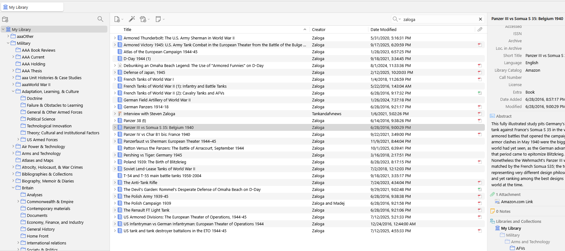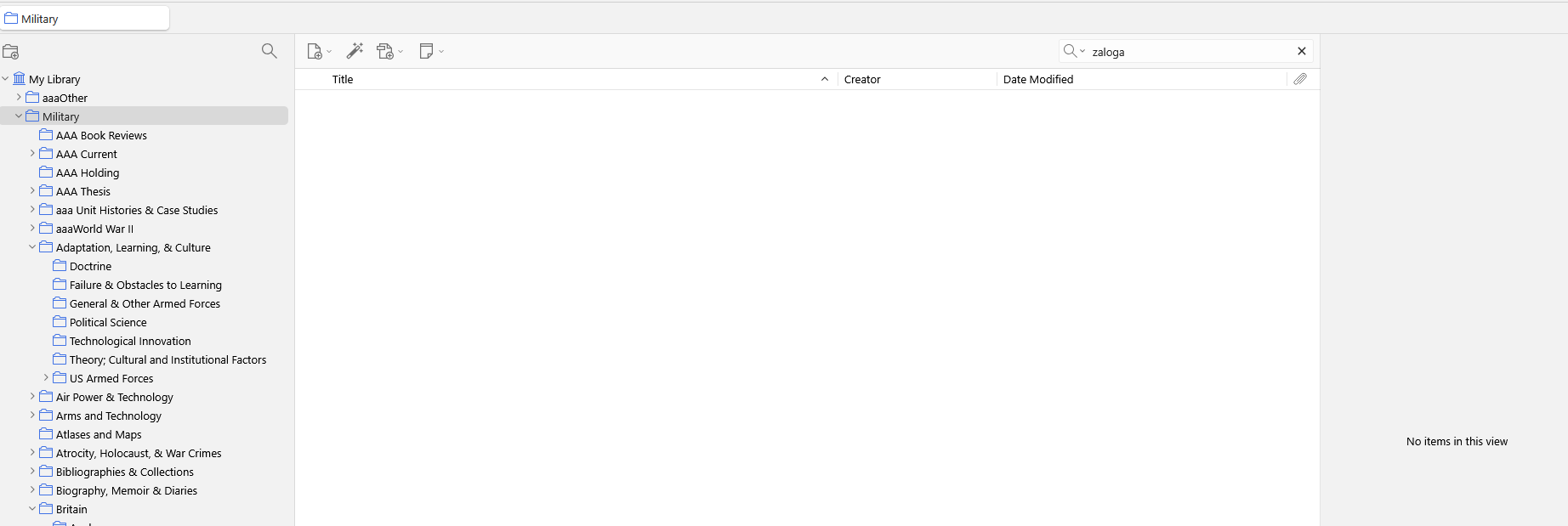 See the attached screenshots. When I search for the term "Zaloga" at the My Library level I get, as expected, many hits. If I search just the Military collection I get no hits, although all the Zaloga books are in the Military Collection (I spot checked).