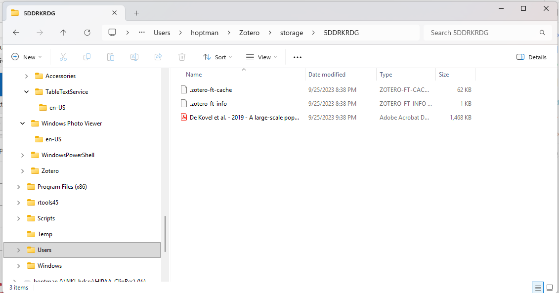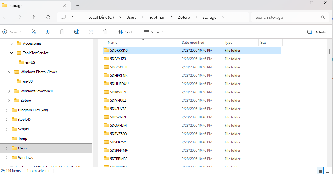 However, I'm having a problem with finding the files within my local storage (set to be in the normal place (c:\users\<username>\zotero\storage). I can add them manually from the 8-character file directories by dragging them into Zotero, but for obvious reasons, I don't want to do that for the whole set.