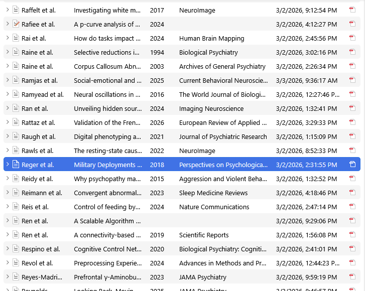 I hope this helps. I have attempted to attach a screenshot, which I am hoping you'll see, but it just lists the references from the center pane of my Zotero instance (columns are Creator, Title, Year, Publication, Date Added, and "Attachment clip").