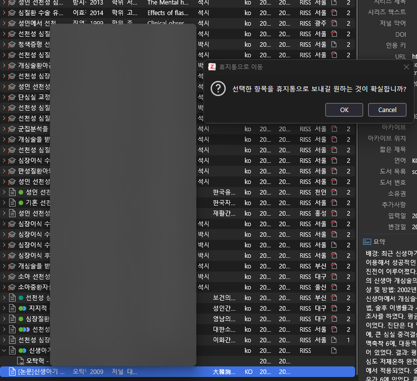 This is a new bug in Zotero 8.0.4. When the 'Move to Trash' dialog pops up, the area where the item pane used to be remains covered by an opaque grey screen, hiding the underlying list. The list only becomes visible again after clicking the button in the dialog.