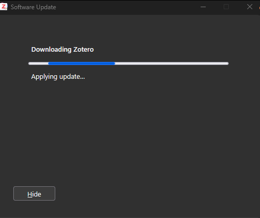 When I "Check for Updates" from the Help menu, I get the Software Update window. But it stops at: "Downloading Zotero", "Applying update...".