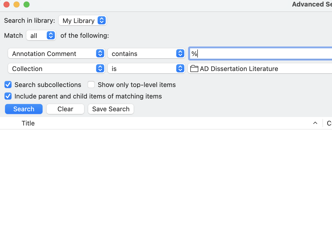 I am encountering an issue when I combine a wildcard search in the "annotation comments" field with "collection" specified.