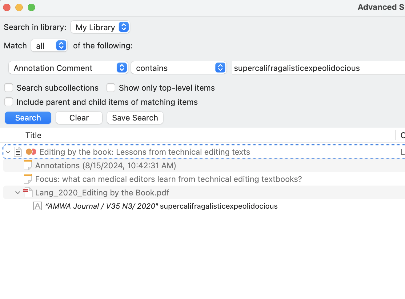 Advanced search on annotation comments AND in collection not working