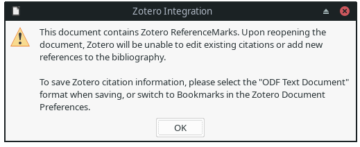 All templates .ott, documents .odt, master .odm were created from scratch, no import from MS Word documents. Is the warning the Zotero app prints on screen and presented on attached screenshot a valid warning also for user group meant here?