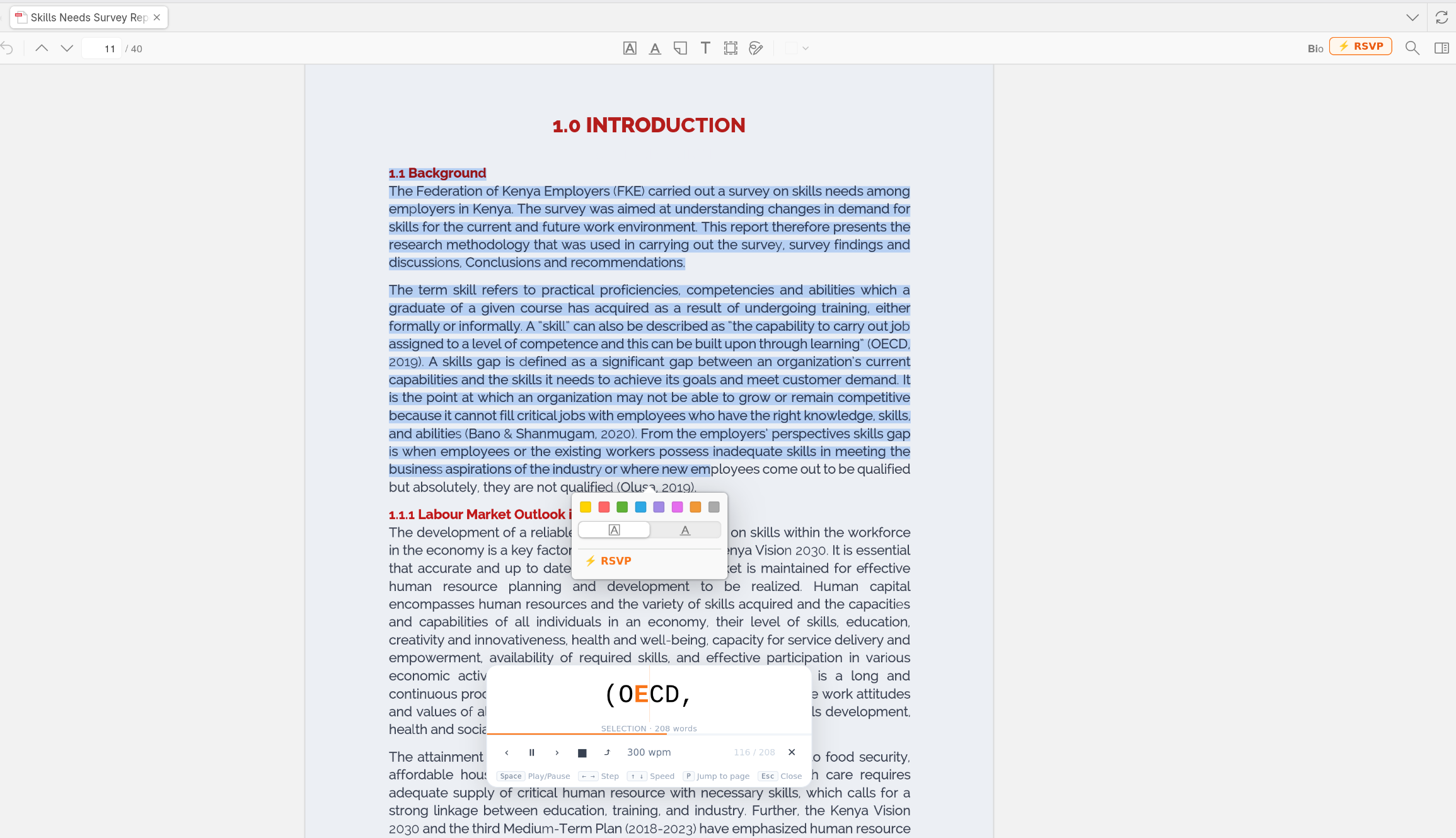 - Select any text in the PDF → RSVP appears in the selection popup → reads just that passage