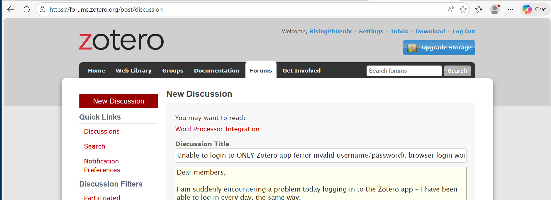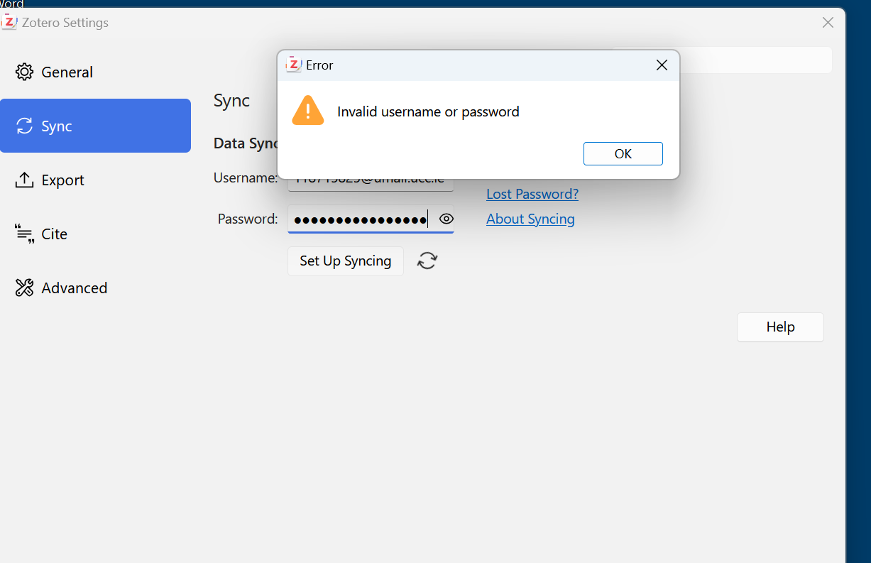 Unable to login to ONLY Zotero app (error invalid username/password), browser login works fine