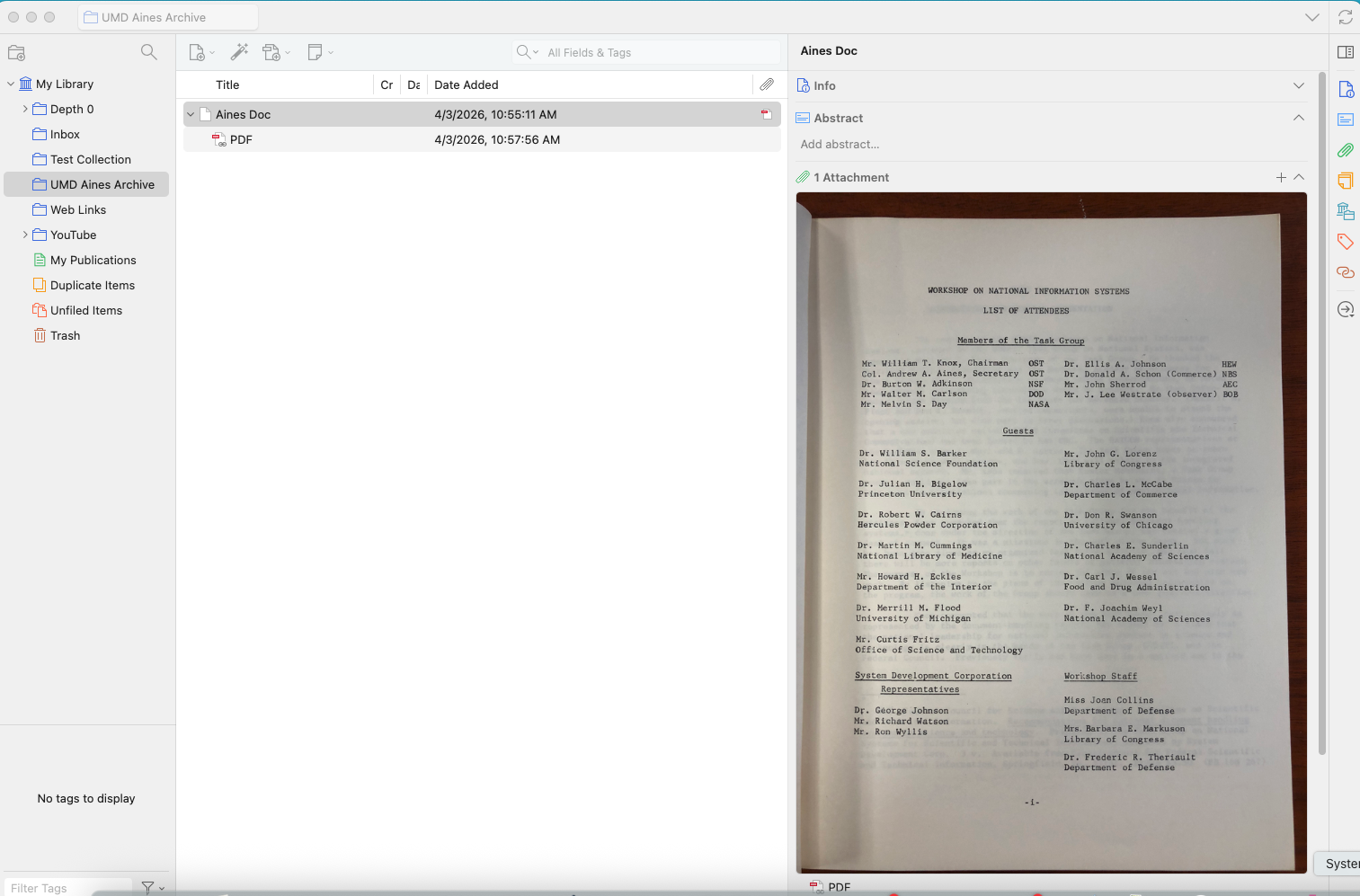 FWIW, and maybe of interest to some of you, the little test archive that I am working with is from early US government investigations in the 1960's and 70's regarding the future role of computer technology and how to coordinate its use in the federal government. The project was led by Col. Andrew Aines and was under the umbrella of COSATI - Committee on Scientific and Technical Information of the Federal Council for Science and Technology. Col. Aines' archive is at the University of Maryland, and I started down this rabbit hole because my father-in-law was involved in the project. It is fun to see what our fathers and grandfathers thought of all this, and what they were able to foresee and what they could never imagine. If you are interested in discussing this, I'd love to chat about it.