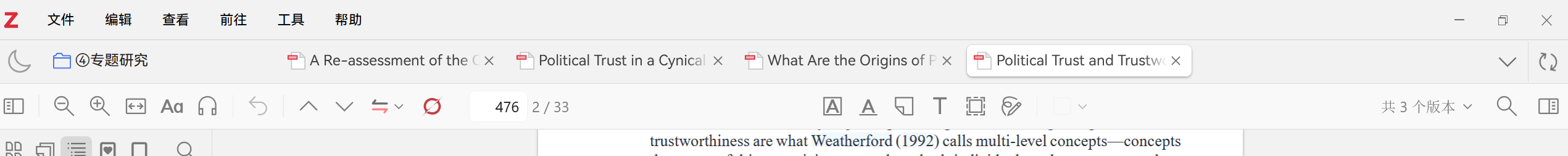 Third, for Zotero’s overall interface, have you considered introducing vertical tabs like those in browsers (similar functionality already exists in some plugins)? This would help save vertical space occupied by non-document UI elements. Additionally, the current horizontal tab bar could still be optimized; for instance, it might be integrated with the top menu bar (File, Edit, View, Tools, etc.), which currently has a lot of empty space on the right side.