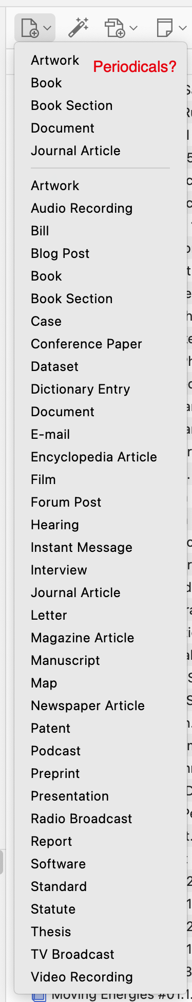 Would it be possible to add options such as 'Newspaper Issue' or ‘Magazine’ to the item type dropdown menu? Or at least an "Other" option? Pleeeeeaaaase!