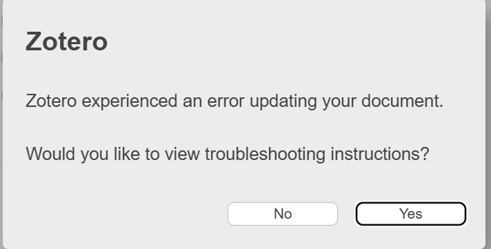 As my document was going to be around 100 pages I never had auto-update on. When I reached 103 pages an error message popped up saying that an error has occurred. I removed 70 pages of text, tried again and an error message was still returned. If I try to cite in a blank document the citation immediately becomes un-linked, so I no longer believe that this is a size of document issue.