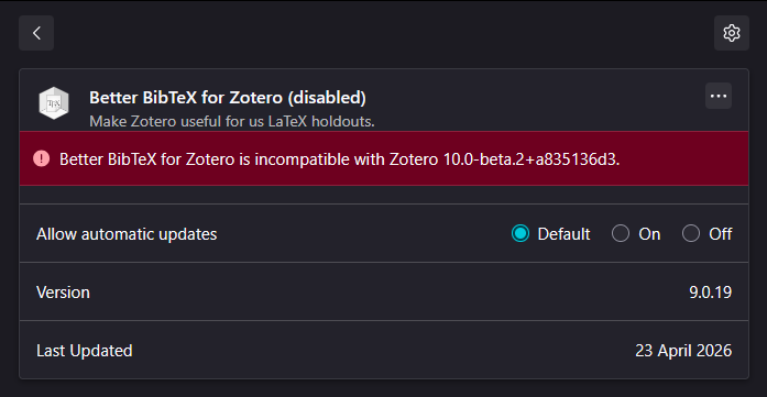 After Switching from Zotero 9.0.1 to the Zotero 10.0-beta.2, the plugin is marked as incompatible.