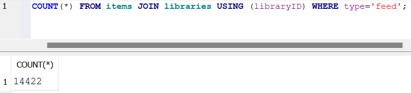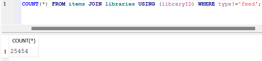 SELECT COUNT(*) FROM itemDataValues;SELECT COUNT(*) FROM items JOIN libraries USING (libraryID) WHERE type!='feed';SELECT COUNT(*) FROM items JOIN libraries USING (libraryID) WHERE type='feed';I've been using Zotero for more than 3 years.
