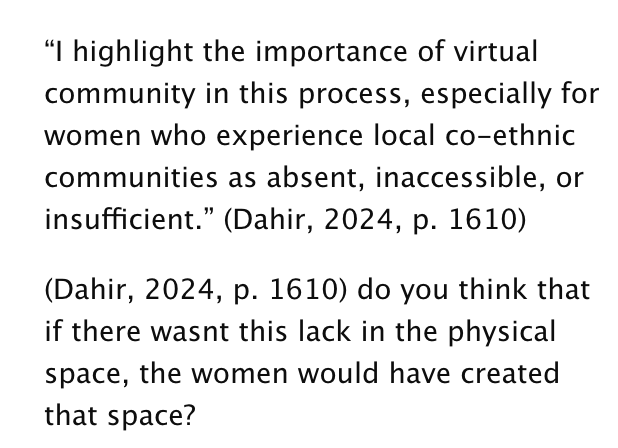 *NOT IN ITALICS* (Dahir, 2024, p. 1610) do you think that if there wasnt this lack in the physical space, the women would have created that space?