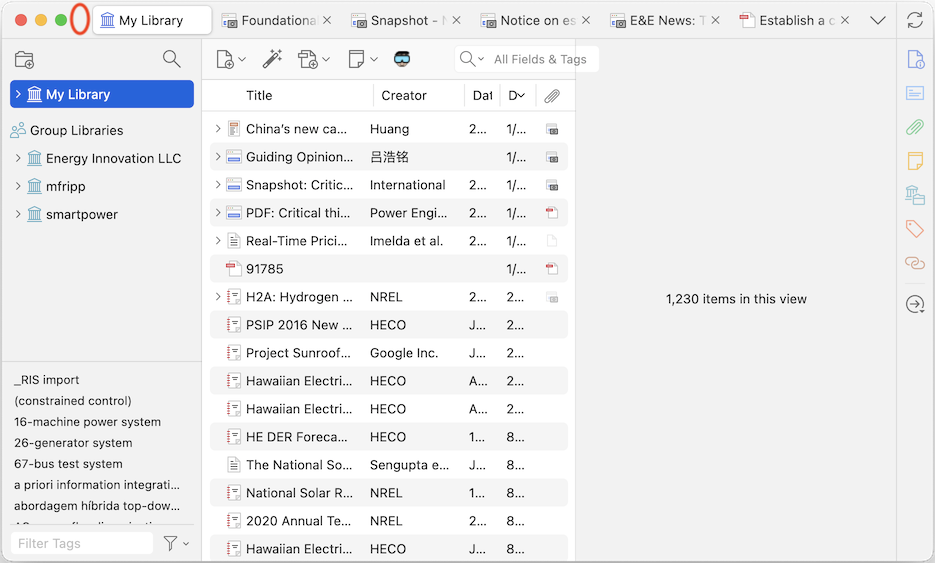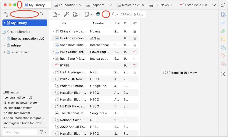 2) You seem to have made your window very narrow in this screenshot. I don't know if that was just for effect or you're purposely using Zotero at a fraction of your screen width, but at a more reasonable width on a standard Mac laptop display, you'd have much more space in the middle section (where you also have a plugin button taking up space). This is Zotero at not even close to full width on a 14" MBP, with a huge draggable area in the middle toolbar: