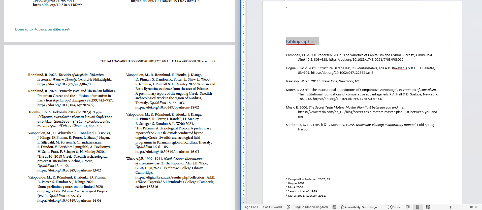 My document preference is Opuscula. However, there are several problems as this Opuscula is not equivalent with the one aquired by my institution at the Stockholm University and The Editorial Committee of the Swedish Institutes at Athens and Rome (ECSI), publishing the Archaelogical journal Opuscula, see https://ecsi.se. and Guide for contributors. There are several errors when using Zotero´s Opucula: no italics in the footnote for ancient publications, no dot following the footnote, the translator is not indicatet though I have added the name, etc. - I asked for help at the University library, which has online courses and information about Zotero, but they could not help me. I have neither got any respons from ECSI, following my inquiry for help. Therefore, I would be very happy getting some help from you to amend Zotero so that it matches the aquired format. - Kind regards, Regina Winzer