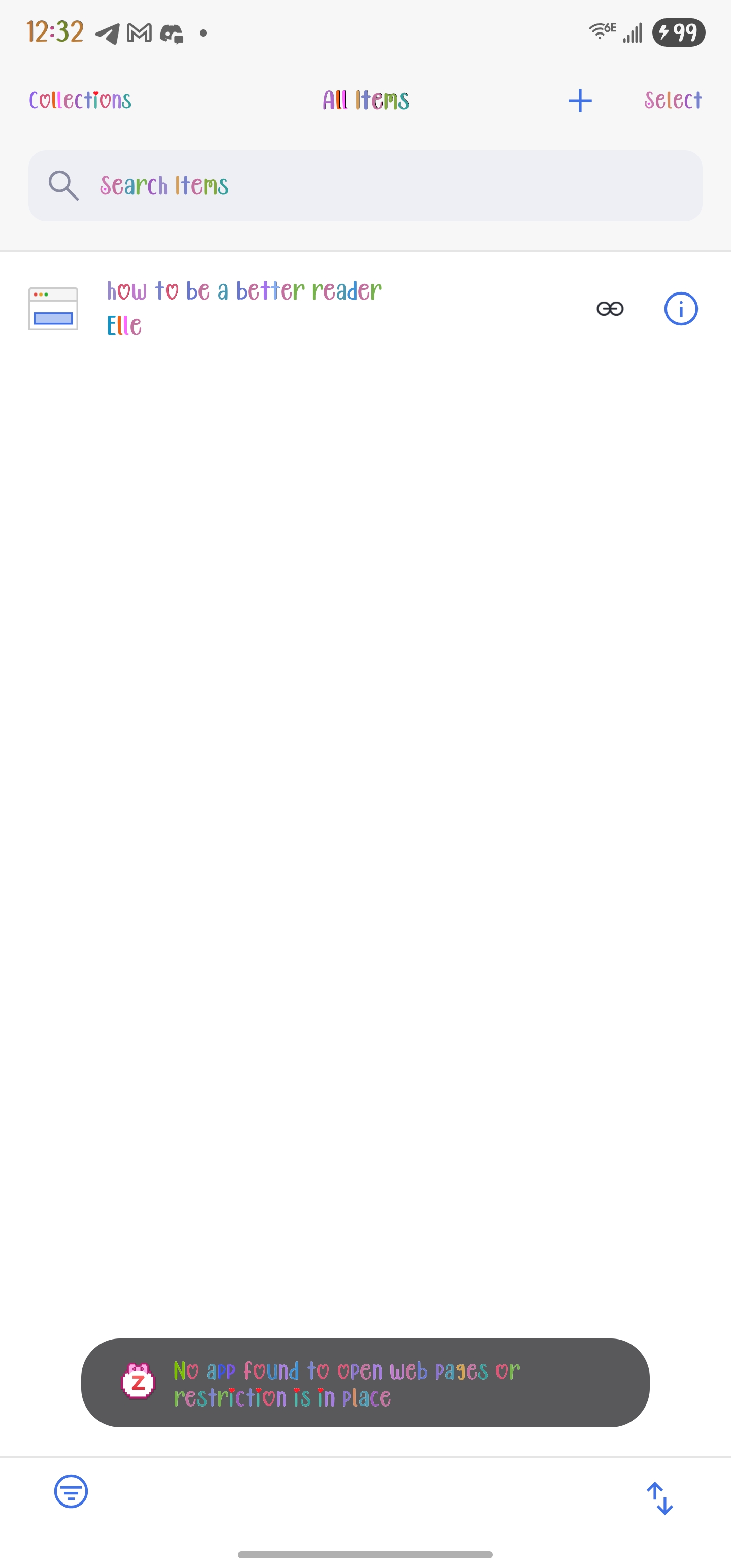 whenever I add an item to my library & attempt to open it, I receive this message ""No app found to open web pages or restriction is in place" - I have searched in a million forums and read that this was supposed to be fixed with the latest update, which is even mentioned in the patch notes on the play store, but it is still not working. It is driving me absolutely insane and it is so frustrating. Could anyone please help me out with this?