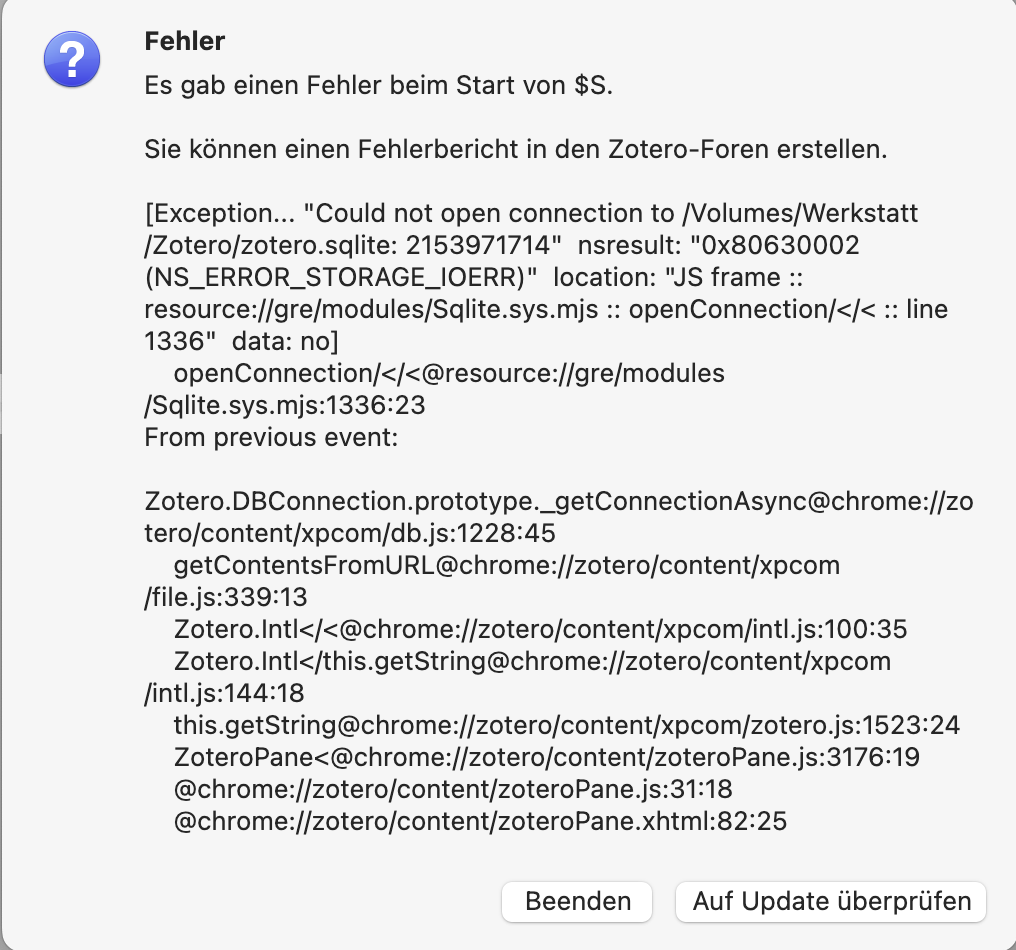 JavaScript Error: "Could not open connection to /Volumes/Werkstatt/Zotero/zotero.sqlite: 2153971714" {file: "resource://gre/modules/Sqlite.sys.mjs" line: 1336}]