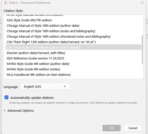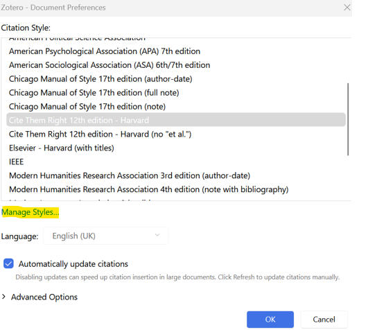 "Manage styles" option missing when clicking "Add/edit citation" in Word