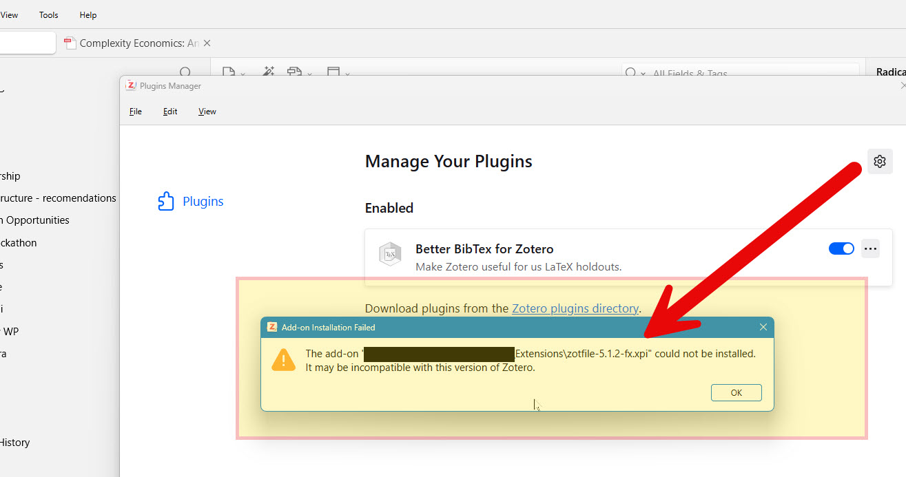 When attempting to install the plugin manually via the Plugins Manager, Zotero shows the following error message: