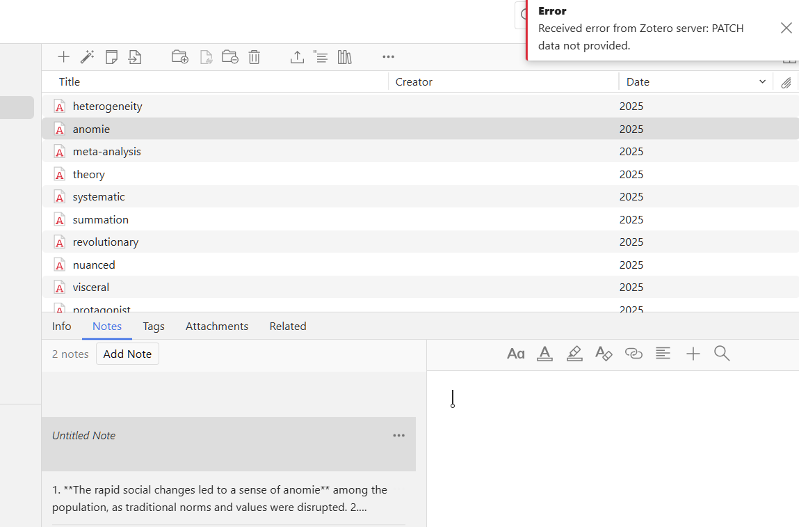 Received error from Zotero server: PATCH data not provided.This is in a small modal on the Web Library page.
