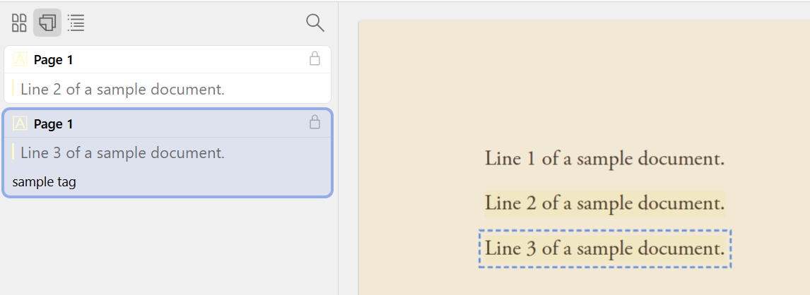 • I'm sorry, but I don't understand the response. I'll attach a screenshot. I've attached a tag called "Sample tag" to the annotation "Line 3 of a sample document". The only way I could do this was by dragging the annotation over "Sample tag" in the list of tags. The Tag icon is greyed out when you are looking at an annotation. As you can see from the screenshot, the Tag icon is greyed out here, so I can't remove the annotation by just showing the list of tags on this annotation and then deleting it.