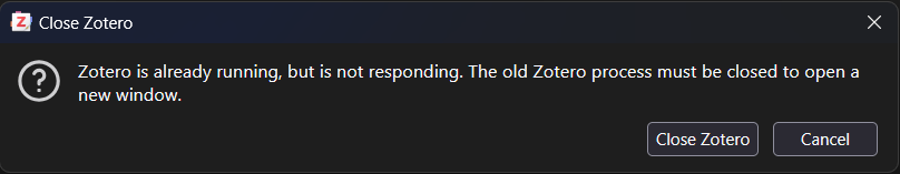 - Clicking “Close Zotero” closes the pop-up, until the same pops up again, and repeats.
